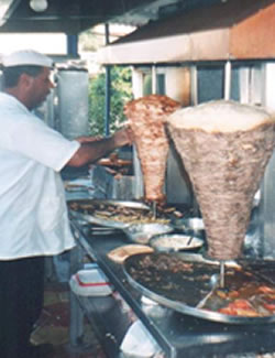 Traditional Lebanese meals are a multi-course affair. Lamb and chicken shawarma (meat which has been roasted slowly and then thinly sliced) and kafta meshwi (ground lamb seasoned with parsley, onions, herbs, and spices) are typical entrées, accompanied by platters of fresh fruit, bowls of roasted nuts, and a tray of bakhlawa (a filo dough pastry with layers of syrup and ground pistachio) or other Lebanese sweets for dessert.