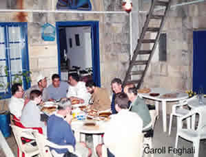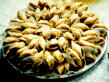 Traditional Lebanese meals are a multi-course affair. Lamb and chicken shawarma (meat which has been roasted slowly and then thinly sliced) and kafta meshwi (ground lamb seasoned with parsley, onions, herbs, and spices) are typical entrées, accompanied by platters of fresh fruit, bowls of roasted nuts, and a tray of bakhlawa (a filo dough pastry with layers of syrup and ground pistachio) or other Lebanese sweets for dessert.